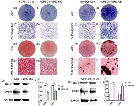 To assess the effect of PER2 on hDPSCs’ differentiation, ALP staining, Alizarin Red S staining and detection of differentiation markers were performed. ALP staining revealed a significant decrease in ALP activity, and Alizarin Red S staining presented fewer mineralized nodules in PER2-sh2 hDPSCs compared to the control group (Figure 4A–H). PER2 depletion resulted in reduced mRNA expression of DMP1, DSPP, ALP, and COL1A1 in hDPSCs (Figure S2A), as well as downregulated expression of dentinogenic differentiation-related proteins DSPP and DMP1 (Figure 4Q,R). Conversely, PER2-overexpression upregulated ALP activity (Figure 4I–L), mRNA expression of DMP1, DSPP, COL1A1 (Figure S2B) and protein expression level of DSPP and DMP1 (Figure 4S,T) in hDPSCs. Alizarin Red S staining also presented an increased number of mineralized nodules in PER2-overexpression hDPSCs (Figure 4M–P).