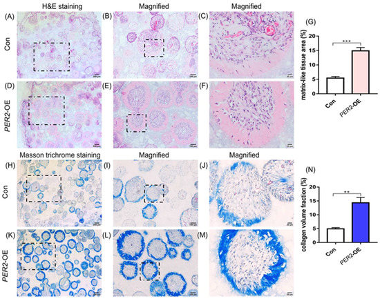 Overexpression of PER2 in hDPSCs enhances collagen deposition and osteodentine-like structure formation. β-TCP scaffolds were loaded with hDPSCs and transplanted into 6-week-old male BALB/c nude mice subcutaneously for 8 weeks. Samples were fixed, demineralized, dehydrated, embedded, sectioned. (A–G) H&E staining showed that hDPSCs colonized in the pores of the scaffolds with the presence of loose connective tissue and osteodentine-like structure was formed around the outer-layer of the cells. Compared with the control group (A–C), the PER2-overexpression group exhibited increased mineralized osteodentine-like formation (D–F). Quantitative analysis of osteodentine-like tissue area was performed by Image-Pro Plus 6.0 (G). (H–N) Compared to the control group (H–J), the PER2-overexpression group exhibited increased collagen deposition according to Masson trichrome staining (K–M). Quantitative analysis of collagen volume area was conducted (N). (B,E,I,L) represented the magnified regions (10×) in (A,D,H,K) black dotted squares, respectively. (C,F,J,M) represent the magnified regions (40×) in (B,E,I,L) black dotted squares, respectively. Scale bar: (A,D,H,K) 200 μm; (B,E,I,L) 100 μm; (C,F,J,M) 20 μm. Data are presented as mean ± SEM. ** p < 0.01, *** p < 0.001.