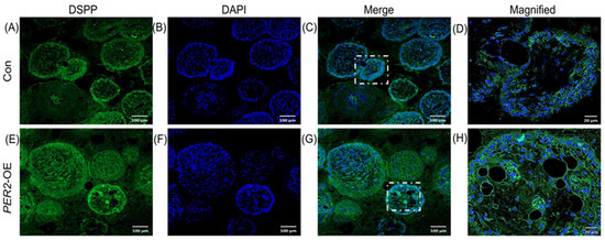 Overexpression of PER2 in hDPSCs enhances DSPP expression in vivo. β-TCP scaffolds were loaded with hDPSCs and transplanted into 6-week-old male BALB/c nude mice subcutaneously for 8 weeks. Samples were fixed, demineralized, dehydrated, embedded, sectioned. (A–H) Immunofluorescence staining of DSPP, an odontoblastic maker, revealed cytoplasmic staining in cells, with stronger staining observed in the PER2-overexpression group (E–H) compared to the control group (A–D). (D,H) represented the magnified regions (40×) in (C,G) white dotted squares, respectively. Scale bar: (A–C,E–G) 100 μm; (D,H) 20 μm.