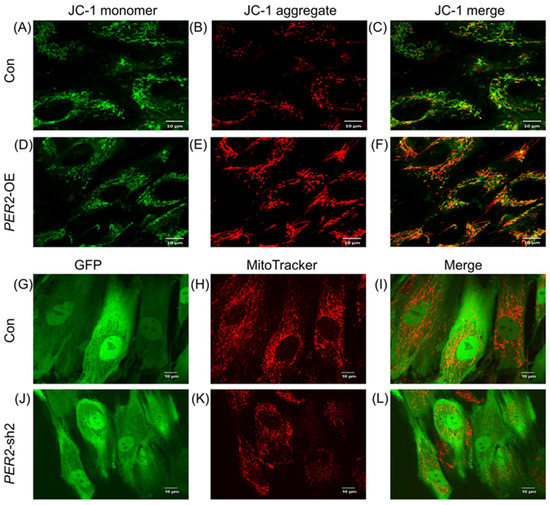 Mitochondrial membrane potential evaluation in PER2-knockdown and PER2-overexpression hDPSCs. (A–F) A higher number of JC-1 aggregates in PER2-overexpression cells (D–F) compared to the control cells (A–C). (G–L) Cells transfected with lentivirus vectors of PER2-sh2 and the control one showed fluorescence upon GFP excitation. Compared to the control group (G–I), PER2 depletion resulted in reduced Mitotracker Red CMXRos staining in hDPSCs (J–L). Scale bar: (A–L) 10 μm.