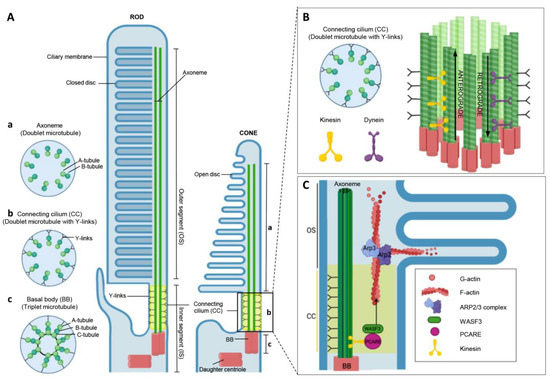 PRs are classified into two groups: rods and cones. They are morphologically and functionally distinct and express several light-sensitive visual pigments, opsins, and other proteins related to phototransduction or disk structure [6]. Rod photoreceptors contain rhodopsin, which functions in dim light and can detect one single photon. In contrast, cone photoreceptors contain cone opsins (short-, medium-, and long-wavelengths), which function in bright light and are responsible for color vision and acuity. PRs have four main structural and functional regions: the cell body, synaptic terminal, inner segment (IS), and OS (a highly modified primary cilium [1]) (Figure 1B). IS and OS are continuous through an extremely narrow connecting nonmotile cilium, a cylindrical stalk containing a modified cilium called the connecting cilium (CC) [9] (Figure 1C). In fact, the OS of the photoreceptor functions as a modified primary cilium. The cilium of OS originates from the CC, a structure that resembles the transition zone (TZ) in other cilia [10]. At the base of the CC lies the basal body (BB), whereas, at the distal end of the CC, it gives rise to the ciliary axoneme, which runs through all the OS. This CC has a bundle of 9 microtubule doublets (9+0 array of microtubules) becoming singlets near the tips [11], serving as (1) a conduit for large amounts of proteins, membranes, and small molecules, biosynthesized in IS, that must be displaced to the OS, and (2) as a diffusion barrier to prevent the flow of OS components to other parts [9,12].