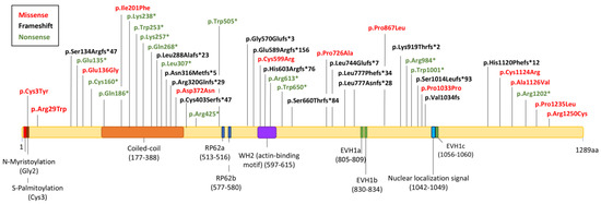 Figure 2. RP54 and CRD-associated mutations in PCARE protein. Schematic representation of missense (red), frameshift (black), and nonsense (green) mutations. In the PCARE structure, colored columns represent the functional motifs: N-myristoylation (Gly2), S-palmitoylation (Cys3), coiled-coil domain (aa 318–333), two RP62 kinase-binding motifs, a WH2 acting binding motif (aa 597–615), three proline-rich regions (EVH1 domain-binding motifs) (aa 805–809, 830–834, 1056–1060), and a nuclear localization signal (aa 1042–1049).