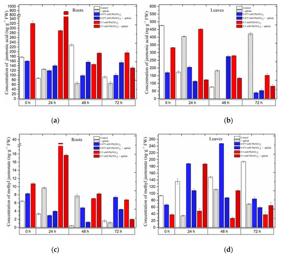 Already at the beginning of the experiment, i.e., 4 days after the administration of lead and before aphid transfer to pea seedlings, a significant accumulation of jasmonates, namely jasmonic acid (JA) and methyl jasmonate (MeJA), was recorded (Figure 4) in the roots of pea seedlings growing on the Hoagland medium with 0.075 and 0.5 mM Pb(NO3)2. The concentrations of JA and MeJA in the roots of pea seedlings, particularly those growing with the sublethal dose of Pb, were more than 1.5 times higher than in the control. In turn, the concentration of MeJA in the roots of pea seedlings growing at the hormetic (0.075 mM Pb(NO3)2) dose was 1.3 times higher than in the control. Statistical analysis confirmed the significance of the differences in these results (Table 1). Moreover, the highest JA level was recorded in 24-h roots (900 ng g−1 FW) of pea seedlings growing at the sublethal (0.5 mM Pb(NO3)2) dose and colonized by pea aphids A. pisum. The content of JA was higher than that in the roots of the seedlings treated only with the sublethal dose of Pb and not infested with aphids and other experimental variants. At the subsequent time point, i.e., at 48 h, higher levels of MeJA were recorded in the roots of pea seedlings infested by aphids and exposed to hormetic (0.075 mM Pb(NO3)2) and sublethal (0.5 mM Pb(NO3)2) doses and during the cross-talk interaction compared to the control. In turn, in 24-h and 48-h leaves of pea seedlings growing on the medium with the hormetic (0.075 mM Pb(NO3)2) dose, a significant increase in MeJA in relation to the control was noted. Additionally, the concentration of MeJA in the 0.5 mM Pb(NO3)2 + aphids variant was higher than that in the control and comparable to the 0.075 mM Pb(NO3)2) variant.