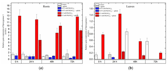 Already at the beginning of the experiment, i.e., 4 days after the administration of lead and before aphid transfer to pea seedlings, a significant increase in the expression level of LOX2 was noted; it was 2.5 times higher than in the control and 0.075 mM Pb(NO3)2 variant (Figure 7). Then, at 24 h, exposure of the pea seedlings to stress factors was associated with downregulation of the LOX2 gene in the roots (Figure 7a). At the next time points (48 h), the expression of LOX2 decreased. However, it remained higher in the roots of pea seedlings infested by aphids (+aphids variant) and the roots of pea seedlings of the 0.5 mM Pb(NO3)2 variant and the 0.5 mM Pb2+ + aphids variant than in the control.