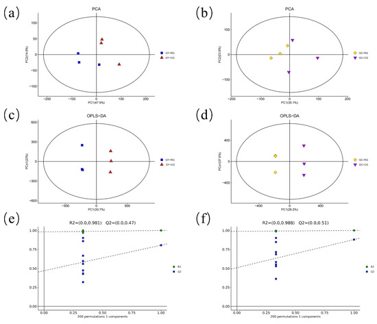 PCA and OPLS-DA score plots generated from plasma metabolic profiles. (a) Untargeted analysis in GY-RG and GY-CG. Cumulative fitness (R2 value) of the PCA model was 0.762. (b) Untargeted analysis in GC-RG and GC-CG. Cumulative fitness (R2 value) of the PCA model was 0.758. (c) OPLS-DA score plot of GY-RG and GY-CG, (R2X (cum) = 0.628, R2Y (cum) = 1, Q2 (cum) = 0.805). (d) OPLS-DA score plot of GC-RG and GC-CG, (R2X (cum) = 0.704, R2Y (cum) = 1, Q2 (cum) = 0.88). The PC1 and PC2 values in the figures represent the scores of each sample for principal components one and two, respectively. Each dot, square, or diamond on the plot represents a sample in the corresponding group. (e) OPLS-DA permutation test (200 times) in GY-RG and GY-CG. The results of the permutation test strongly indicate that the original model was valid (R2 intercept = 0.981, Q2 intercept = 0.47) (f) OPLS-DA permutation test (200 times) in GC-RG and GC-CG. The results of the permutation test strongly indicate that the original model was valid (R2 intercept = 0.988, Q2 intercept = 0.51). GY, Guanling yellow cattle; GC, Guanling crossbred cattle; CG, control group (the basal diet group); RG, DDGS 25% concentrate group.