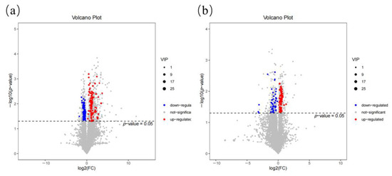 The VIP values were obtained according to the OPLS-DA model, and potential metabolites were found based on VIP > 1 and p < 0.05. To support metabolite identification, the following databases were used: the HMDB (http://www.hmdb.ca/, accessed on 10 June 2022), Lipidmaps (v2.3), METLIN (http://metlin-scripps.edu/, accessed on 10 June 2022), and the KEGG (http://www.genome.jp/KEGG/, accessed on 10 June 2022). The KEGG was used to annotate the main differential metabolites. The pathway enrichment analysis was performed using the KEGG ID of the differential metabolites, and the hypergeometric test was applied to find if a pathway was significantly enriched (p < 0.05 of enrichment analysis) in the differential metabolites compared to the whole background, with p < 0.05 of enrichment analysis as the threshold. Moreover, the pathway topology was analyzed based on the relative betweenness centrality with a bos taurus pathway library of KEGG database.