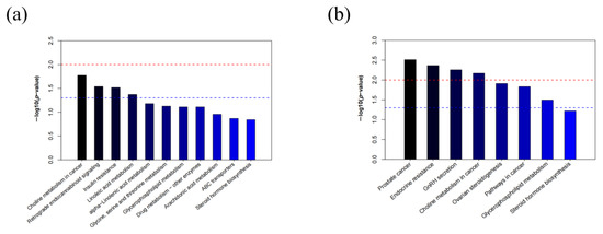 Metabolic pathway analysis of the differentially expressed metabolites in GY-RG vs. GY-CG (a) and GC-RG vs. GC-CG (b). In (a,b), the red dotted line indicates a p-value of 0.01, and the blue dotted line indicates a p-value of 0.05. The color of the bar graph from light to dark indicates that the p-value decreases in order, and when the top of the bar is higher than the blue line, a pathway is considered to be significant.