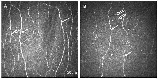 In vivo confocal corneal microscopic records in a healthy control eye (A) and in an eye of a patient with SLE and dry eye (B). The density and thickness of subepithelial nerve plexi (arrow) and the number of branches (arrowhead) are reduced in SLE compared to normal eyes. Langerhans cells are present in SLE (empty arrow). The same scale bar is applicable to Figure 1A,B.