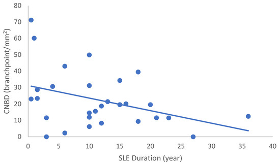Correlation of CNBD with disease duration (r = −0.389; p = 0.040).