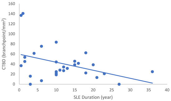 Correlation of CTBD with disease duration (r = −0.415; p = 0.028).