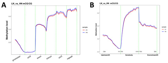 The analysis of methylation levels in each functional genomic region revealed that the methylation in the 5′-untranslated region (UTR5) was at a minimal level (Figure 1A). In contrast, the levels of methylation in the 3′-untranslated region (UTR3) and repeated region were notably higher compared to other regions in both the LN and HN groups. In the exon, intron, UTR3, and repeat regions, the methylation levels were slightly lower in the LN group than in the HN group. Within the gene structure, methylation was at the lowest level at the translation start site (TSS). The methylation level was increased with the distance from the TSS towards upstream or downstream in the coding regions (Figure 1B). The downstream region at a distance of 2 kb from the translation end site (TES) had a lower methylation level compared to TES.