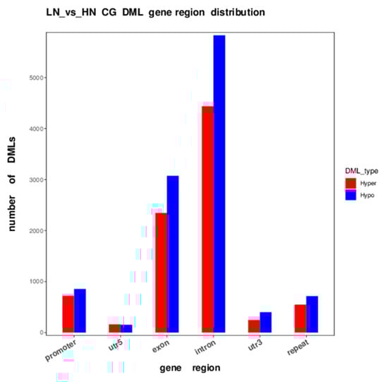 DML distribution in CG context in different functional regions. The x-axis is functional regions; the y-axis is the number of hyper/hypo DMR in each region. Hyper and hypo DMLs in LN fetuses are indicated as red and blue, respectively.