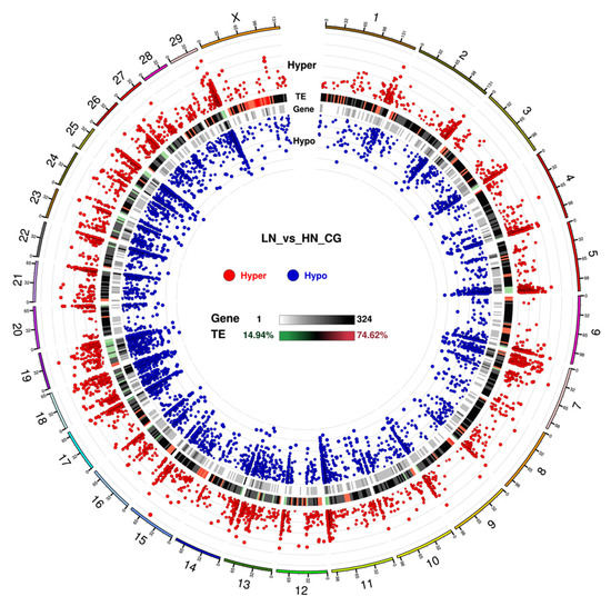 In the promoter region, the number of hypomethylated loci was 1.19-fold higher than that of the hypermethylated loci in the LN fetuses. Notably, in the gene body and repeat regions, the ratio of the hypermethylated loci/total hypermethylated loci was similar to the ratio of the hypomethylated loci/total hypomethylated loci, whereas the ratio of hypermethylated loci was slightly different from that of hypomethylated loci in promoter and UTR. The significance and distribution of DMR on specific chromosomes are illustrated in a circus plot (Figure 3). The telomeric region in most of the chromosomes showed an abundance trend in both hyper- and hypo DMR. Meanwhile, chromosomes 18, 19, 23, and 25 were dense with uniformly distributed DMR. Notably, the upstream region, excluding the telomeric region, of chromosome 7 was abundantly hypermethylated and hypomethylated, which was not observed in the other chromosomes.