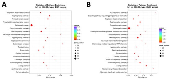 The scattered plot of DMR-related pathways analyzed by KEGG enrichment. (A) Genes of all hyper DMR regions, (B) genes of all hypo DMR regions. The x-axis represents the Rich factor, and the y-axis represents the pathway name. The size of points stands for DMR-related gene counts, and the colors stand for different q-values ranges.