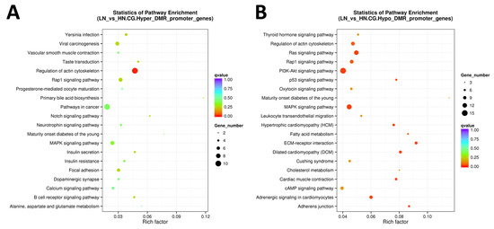 The scattered plot of DMR-related pathways analyzed by KEGG enrichment. (A) Genes of hyper DMR in promotor, (B) genes of hypo DMR in promotor. The x-axis represents the Rich factor, and the y-axis represents the pathway name. The size of points stands for DMR-related gene counts, and the colors stand for different q-values ranges.