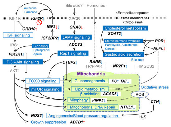 Hypothetic scheme of DM gene-associated molecular regulatory networks and metabolisms in MUN fetal liver. Up- and downward arrows indicate hyper- and hypomethylation in promotor (red) or gene-body (blue), respectively. The pathway/metabolism boxes filled in blue are significantly extracted as relevant to DM genes. Grayed genes are not determined in this study. Solid and chain lines indicate direct and indirect regulations and indirect relationships, respectively.