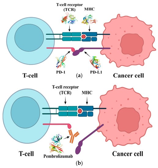 (a) The interaction of T cell receptor (TCR) with the major histocompatibility complex (MHC). It initiates T cell activation, and the interaction of PD-1 with PD-L1 will lead to the inhibition of T cell. (b) Pembrolizumab blocks the connection between PD-1 and PD-L1, thus preventing T cell inhibition and restoring its activity.