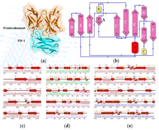 (a) The crystal structure, and (b) the topology of the PD-1/Pembrolizumab complex. The secondary structure elements of (c) the PD-1, (d) the light-chain of Pembrolizumab and (e) the heavy-chain of Pembrolizumab.