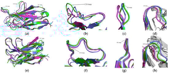 Structural dynamics of the PD-1 and PD-1/Pembrolizumab complex at 100 ns (green), 150 ns (slate), and 200 ns (magenta). (a) PD-1, (b) C’D loop in PD-1, (c) FG loop in PD-1, and (d) A’B loop in PD-1. (e) PD-1 in the PD-1/Pembrolizumab complex, (f) C’D loop in the PD-1/Pembrolizumab complex, (g) FG loop in the PD-1/Pembrolizumab complex, and (h) A’B loop in the PD-1/Pembrolizumab complex.