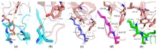 To investigate the interaction mechanism of PD-1 with Pembrolizumab, the simulated structures of the PD-1/Pembrolizumab complex were analyzed at 100 ns, 150 ns, and 200 ns. Interactions occur mainly at three different sites on PD-1, namely in the FG loop, in the C’D loop and near the CC’ loop. Residues Ser60, Glu61 and Phe63 in the BC loop are only involved in the interaction between PD-1 and the light chain of Pembrolizumab with Tyr34 and Tyr57 in the initial state (Figure 4a). Residues Leu128, Lys131, and Ala132 of the FG loop in PD-1 form hydrogen bonds with residues Tyr53, Tyr57, and Leu58, Val62 of the Pembrolizumab light chain during different time scales (Figure 4b–e).