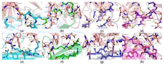 The C’D loop contributes to a large number of hydrogen bonds in the interaction of PD-1 with Pembrolizumab. The C’D loop residues such as Arg86, Ser87, Gln88, Pro89, Gly90 and Asp92 form hydrogen bonds with residues Thr35, Asn52, Asn55, Gly57, Thr58, Asn59, Arg99, Phe103, and Asp104 at 200 ns of Pembrolizumab (Figure 5a–d). CC’ loop regions are also involved in the interaction with the heavy chain of Pembrolizumab. The C strand and C’ strand regions allow more interactions with PD-1 Asn66, Tyr68, Arg69, Asn74, Gln75, Thr76, Asp77, and Lys78 due to the presence of side chain Thr30, Asn31, Tyr33, Ser54, Asn55, Tyr101, Arg102, Phe103, which may contribute to the stability of PD-1 (Figure 5e–h).