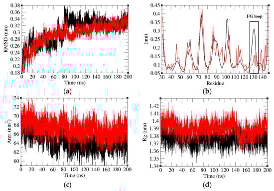 (a) Root mean square deviations, (b) root mean square fluctuations, (c) solvent accessible surface area, and (d) radius of Gyration of PD-1 (black) and PD-1 in the PD-1/Pembrolizumab complex (red).
