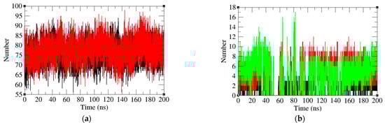 Hydrogen bond analysis is a widely used method to study protein–protein interactions. The average number of hydrogen bonds in PD-1 and PD-1 in the PD-1/Pembrolizumab complex was reported to be 78 and 76, respectively. The Rg results indicate that the PD-1 has a less compact structure (Figure 7a). This might be due to the fact that PD-1 has more loops that can move freely. The average number of hydrogen bonds between Pembrolizumab and three specific regions of the PD-1 protein, namely, the FG loop, the CD loop, and the C and C’ strands were found to be 1, 4, and 4, respectively. (Figure 7b). The number of hydrogen bonds on FG loop and C’D loop remained stable after 80 ns time scale. In contrast, the number of hydrogen bonds on the C strand and C’ strand starts to increase at 150 ns, and eventually increases from 4 at 100 ns to 7 at 200 ns. This may indicate that the number of amino acids involved in the C strand and C’ strand to bind to Pembrolizumab increases.