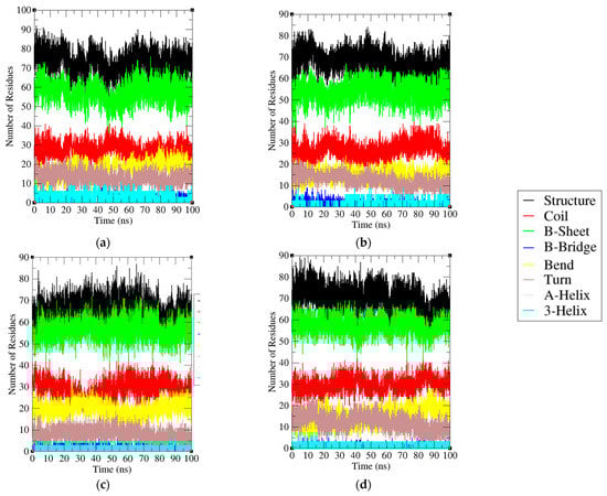 It was found that the average residues involved in the PD-1 total structure, coil, β-sheet, β-bridge, bend, and turn are 57%, 25%, 49%, 1%, 17%, and 7%, respectively. On other hand, the average residues involved in the PD-1/Pembrolizumab total structure, coil, β-sheet, β-bridge, bend, and turn are 61%, 25%, 50%, 0%, 13%, and 11%, respectively (Table 2). A secondary structure analysis of PD-1 and PD-1/Pembrolizumab complex showed that the interaction with Pembrolizumab resulted in a decrease in bends and β-bridges and an increase in the total amount of secondary structure, β-sheet and turn. The increased percentage of amino acids involved in secondary structure formation enhances the stability of the protein structure, leading to inhibition of the interaction between PD-1 and PD-L1. The secondary structure of the light and heavy chains of Pembrolizumab is also shown (Figure 8a–d).