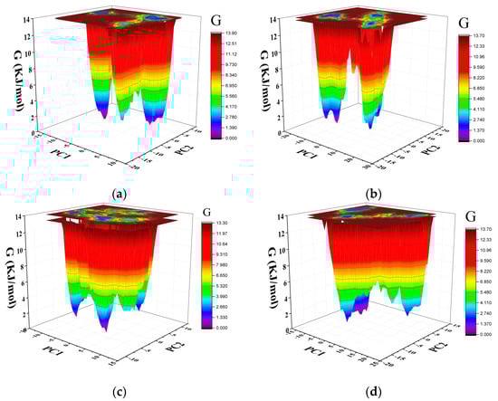The Gibbs free energy (GFE) landscape provides information about protein folding and states. The Gibbs free energy landscape was computed using gmx covar, gmx anaeig, and gmx sham using the projections of their own first (PC1) and second (PC2) eigenvectors, respectively. The closer the color is to blue, the lower the free energy. Multiple peaks of low free energy indicate that the protein can switch between different conformations. The GFE landscape of Pembrolizumab light chain, Pembrolizumab heavy chain, PD-1 in the PD-1/Pembrolizumab complex and PD-1 were plotted separately (Figure 9a–d). PD-1 has a larger area of lower free energy regions, and PD-1/Pembrolizumab complex have multiple peaks. This suggests that PD-1 may undergo structural changes more readily.