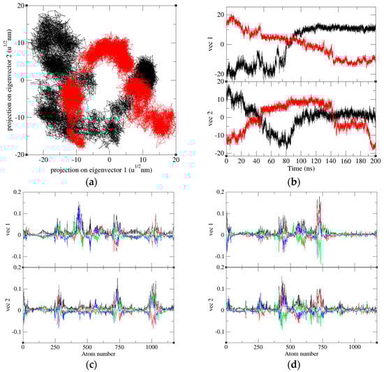 The plot of eigenvectors with eigen components. (a) The 2D projections of trajectories on eigenvectors of PD-1 (black) and PD-1 in the PD-1/Pembrolizumab complex (red). (b) The projections of trajectories on eigenvectors of PD-1 (black) and PD-1 in complex (red) at different time scale. Eigenvector components were further calculated for (c) PD-1 and (d) PD-1 in the PD-1/Pembrolizumab complex. The eigenvector components pertaining to the total, x-axis, y-axis, and z-axis were represented by the colors black, red, green, and blue, respectively.