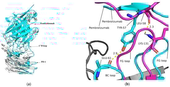 The 200 ns simulation revealed a displacement of PD-1 and Pembrolizumab. By comparing the structure at 200 ns with the initial state, it was observed that PD-1 rotated as a whole around the axis of the C’D loop in relation to Pembrolizumab (as shown in Figure 11a). Additionally, it was observed that after 200 ns of simulation, the FG loop of PD-1 occupied a binding site on Pembrolizumab, which is the binding site of the BC loop of PD-1 at the starting state (Figure 11b).