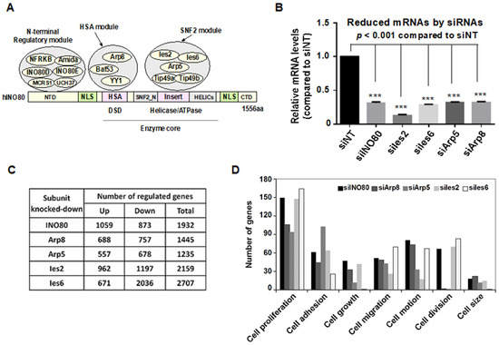 The INO80 complex was mainly involved in regulating cell proliferation and cell viability. (A) Functional modules of INO80 complex. NTD, N-terminal domain; HSA, helicase-SANT-associated domain; SNF2_N, SNF2 family N-terminal domain; Ins, insertion domain; HELICc, Helicase C-terminal domain; CTD, C-terminal domain. (B) Relative mRNA levels in siINO80, siArp8, siArp5, siIes2, and siIes6 transfected HeLa cells. *** p < 0.001 compared to the siNT group. (C) Differentially expressed gene numbers in INO80, Arp8, Arp5, Ies2, and Ies6 knockdown HeLa cells. (D) Gene Ontology (GO) terms analysis in INO80, Arp8, Arp5, Ies2, and Ies6 knockdown HeLa cells.