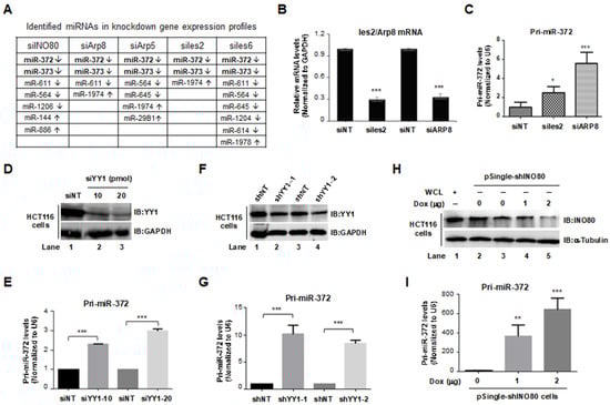 Elevated pri-miR-372 expression level was detected in INO80-complex knockdown HCT116 cells. (A) miR-372/373 were identified in INO80 complex knockdown HeLa cells. Downregulation: ↓, Upregulation: ↑. (B) Knockdown efficiency of Ies2 and Arp8 in HCT116 cells. *** p < 0.001, compared to the siNT group. (C) Pri-miR-372 expression levels in siIes2 or siArp8 transfected HCT116 cells. * p < 0.05 or *** p < 0.001, compared to the siNT group. (D) Knockdown efficiency of siYY1. GAPDH was used as an internal control. (E) Pri-miR-372 expression levels in siYY1 transfected HCT116 cells. *** p < 0.001 compared to the siNT group. (F) The YY1 protein level in pLVX-shYY1-transfected HCT116 cells. GAPDH was used as an internal control. (G) Pri-miR-372 expression levels in pLVX-shYY1 transfected HCT116 cells. *** p < 0.001, compared to the siNT group. (H) Dox-induced INO80 knockdown efficiency. α-Tubulin was used as an internal control. (I) Pri-miR-372 expression levels in Dox-induced INO80 knockdown HCT116 cells. ** p < 0.01 or *** p < 0.001, compared to the no-Dox induction group.