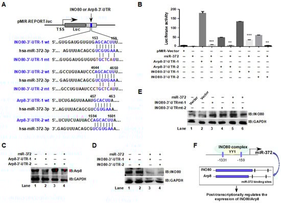 The previous experimental results suggest that Arp8 and INO80 may be miR-372 targeted regulatory genes. To confirm whether miR-372 can bind to the 3′-UTR of INO80 and Arp8 and post-transcriptionally regulate their expression levels, we predicted possible binding sites in the 3′-UTR of INO80 and Arp8. We found two possible binding sites in the 3′-UTR of INO80 (153–159 and 4644–4650) and Arp8 (457–463 and 1594–1601), respectively, and introduced the DNA fragments containing the binding sites into the pMIR-REPOIRT-Luc vector to construct the luciferase reporter gene plasmid. Concurrently, the mutagenic plasmid of the miR-372 binding site in the INO80-3′-UTR was designed and constructed (Figure 5A). First, pMIR-REPORT-INO80-3′-UTR and pMIR-REPORT-Arp8-3′-UTR plasmids (a vector carrying the wild-type 3′-UTR of Arp8 and INO80) were transiently transfected into HCT116 cells, and the luciferase activities were detected in the presence or absence of miR-372. As shown in Figure 5B, the luciferase activities were significantly inhibited by co-transfection with miR-372 compared to the no-miR-372 group (** p < 0.01, *** p < 0.001). As expected, co-transfection of pMIR-REPORT-INO80-3′-UTR or pMIR-REPORT-Arp8-3′-UTR with miR-372 reduced Arp8 (Figure 5C, lanes 2 and 4) or INO80 (Figure 5D, lanes 3 and 4) protein levels compared those to the transfection of pMIR-REPORT-INO80-3′-UTR or pMIR-REPORT-Arp8-3′-UTR only group, suggesting that INO80 and Arp8 may be the targets of miR-372. Furthermore, while the miR-372 target sites in the 3′-UTR of INO80 linked to the luciferase reporter were mutagenized, both mutant sites lost their response to miR-372, and the INO80 protein level no longer decreased due to the co-transfection of miR-372 (Figure 5E, lanes 5 and 6), indicating the site-specificity of the repression. The above experimental results suggest that there is a functional interaction between the INO80 complex and miR-372: INO80 regulates the expression of miR-372, which in turn affects the stability and function of the INO80 complex by binding to its 3′-UTR (Figure 5F).