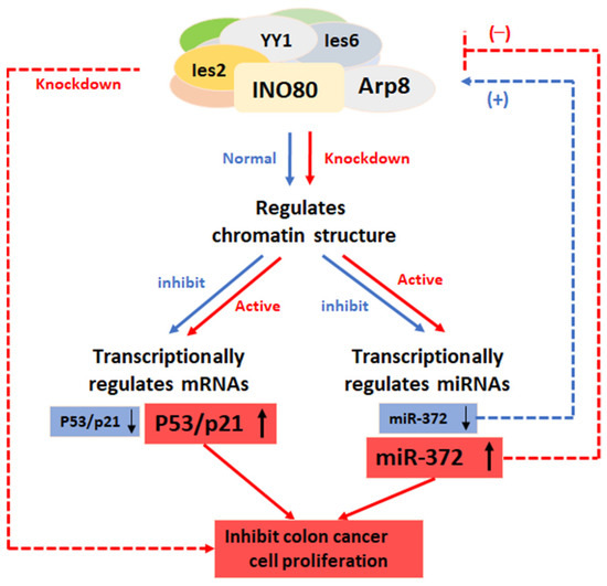In conclusion, the experimental results in this paper reveal the mutual regulatory relationship between miR-372 and the INO80 complex and make it clear that miR-372 can directly interact with the 3′-UTR of multiple components in the complex, thereby post-transcriptionally regulating the expression and stability of the complex, altering the complex’s chromatin remodeling activity, which in turn further affects the intracellular biological function of the INO80 complex. As shown in the schematic diagram below (Figure 7), in normal cells, both miR-372 and p53/p21 are suppressed by the INO80 complex by regulating the chromatin structure; when the INO80 complex is silenced, it will lead to instability of the complex and loss of chromatin remodeling enzyme activity; thus, the inhibition of INO80 complex on miR-372 and p53/p21 is released, leading to the up-regulation of miR-372 and p53/p21 expression, further inhibiting the proliferation of HCT116 colon cancer cells. However, most data supporting the above mutual regulation model are limited to HCT116 cells in this study, and whether such a regulatory pattern also exists in other cancer types still needs to be verified. In summary, the results of this paper provide a theoretical basis for elucidating the mechanism of action of the INO80 chromatin complex and provide new ideas for the development of subsequent cancer therapeutics. MiR-372 is also expected to serve as a biomarker for early cancer diagnosis.