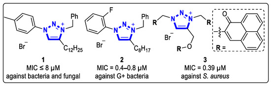 Analogues of the functional 1,3,4-trisubstituted-1,2,3-triazolium bromide salts have demonstrated excellent antibiotic properties. In 2018, Fletcher et al. synthesized a series of 1,3,4-trisubstituted-1,2,3-triazolium bromide salts through a two-step process involving azide-alkyne cycloaddition and benzyl substitution [13]. Several of these compounds exhibited good antibacterial activities against gram-positive (G+) strains and gram-negative (G-) strains. Compound 1 demonstrated the best antibacterial activity, with minimum inhibitory concentration (MIC) values of less than 8 µM. In addition, it displayed a good inhibitory effect against yeast, with a MIC value of 8 µM against Saccharomyces cerevisiae (S. cerevisiae) (Figure 1).