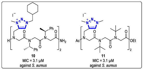Amphiphilic cationic peptides with N-substituted glycine showed great prospects as antimicrobial peptide mimetics. In 2018, Faure and coworkers obtained a series of 1,2,3-triazolium cationic amphiphilic peptide oligomers on a carrier [23]. Short hexamer 10 had a great inhibitory effect against G+ bacteria with MIC values of 6.3 μM and 3.1 μM against E. faecalis and S. aureus, respectively (Figure 3). Furthermore, this hexamer was found to be non-hemolytic and non-cytotoxic to Hela cells.