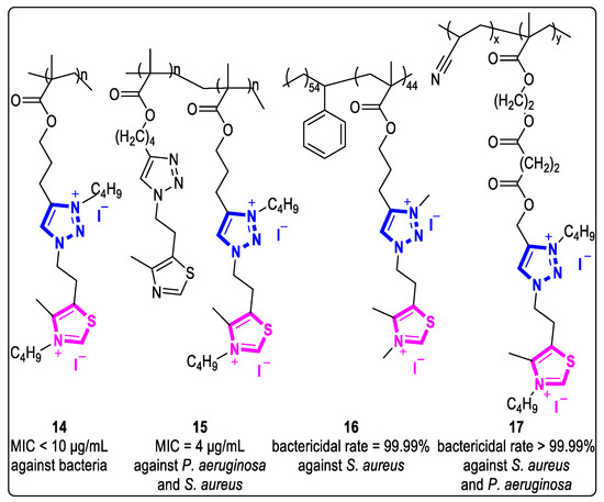 In 2015, Tejero et al. prepared polys (methyl methacrylate) using alkynyl alcohols and thiazole azide derivatives as raw materials [27]. The N-alkylation of the azole ring allowed the preparation of unipolar and polar polyelectrolytes with different amphiphilic properties, resulting in their antibacterial activity against various microorganisms. Compound 14, for example, showed significant antibacterial activities, with MIC values less than 10 µg/mL against P. aeruginosa, S. aureus, S. epidermidis, and MRSA (Figure 5).