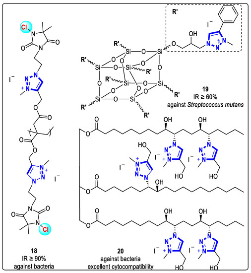To minimize the decreasing effect of ionic bactericidal compounds on the mechanical strength of dental composites, Yeganeh et al. (2017) prepared bactericidal dental nanocomposites containing 1,2,3-triazolium-based functionalized polyhedral oligomeric silsesquioxane (POSS) additives through thiol-one click polymerization. The addition of the triazolium cation resulted in increased bactericidal activity of complex 19 (Figure 6) compared to similar compositions containing dimethyl aminoethyl methacrylate monomers (DMAEMA-BC). The inhibition rate (IR) of complex 19 against Streptococcus pyogenes (S. pyogenes) was above 60% [33].