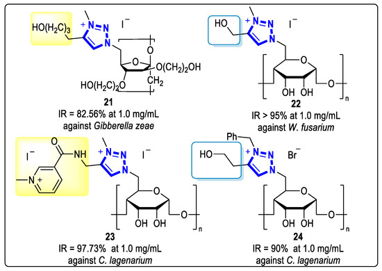 Meanwhile, the inhibition rates of compound 23 (starch derivative bearing 1,2,3-triazolium and pyridinium) against C. lagenarium, F. oxysporum, and W. fusarium were >97%, >90%, and >65% at 1.0 mg/mL, respectively (Figure 8) [7].