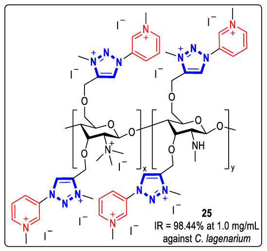 In 2018, Tan et al. synthesized several 1,2,3-triazolium chitosan derivatives and evaluated their biological activities. They found that the antifungal properties of the 1,2,3-triazolium-functionalized chitosan were significantly improved compared to those of 1,2,3-triazole chitosan. Among the tested compounds, compound 25 showed a good inhibition rate of 98.44% at 1.0 mg/mL against C. lagenarium, followed by 79.16% and 67.56% against W. fusarium and F. oxysporum, respectively (Figure 9). Notably, the cationic chitosan derivative 25 remained active against the tested fungi when the concentration of compound 25 was reduced to 0.5 mg/mL. In addition, the chitosan derivatives bearing the 1,2,3-triazolium group showed no cytotoxicity to cucumber seedlings [9].