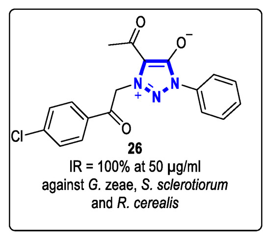 In 2018, Glukhareva and colleagues synthesized a series of 1,2,3-triazolium-5-olates, and tested their anti-phytopathogenic fungal activities. Compound 26 showed the best effectiveness against 6 fungal strains (Figure 10), including Phytophthora infestans (P. infestans), Cercospora arachidicola (C. arachidicola), Alternaria solani (A. solani), G.zeae, Sclerotinia sclerotiorum (S. sclerotiorum) and Rhizoctonia cerealis (R. cerealis), with inhibition rates of more than 80% at a concentration of 50 μg/mL [35].