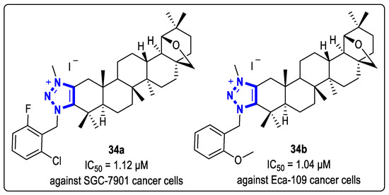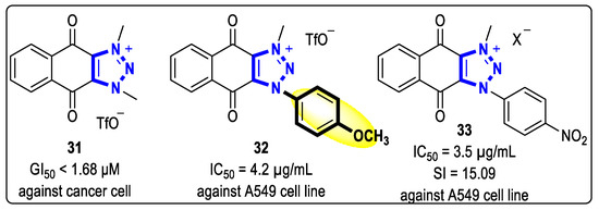 Two years later, Silva et al. synthesized a series of 1,2,3-triazolium salt compounds with different substituents and tested their inhibitory activities on several cancer cells, including osteomyeloid leukemia HL-60, lymphoid leukemia JURKAT, breast cancer MCF-7 and colon cancer MCT-116. Compound 28 (Figure 12) demonstrated significant anticancer activity compared to other triazolium salts, with a half-maximal inhibitory concentration (IC50) value of 3.4 µM against HL-60 cell lines [36].