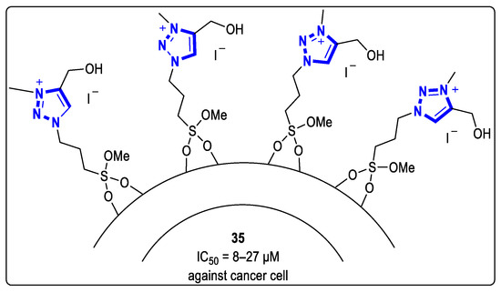 The IC50 values of 1,2,3-triazolium salt 29 against MDAMB-231, 4T1, and HEK-293 cancer cell lines were 60.1, 25.1, and 49.6 µM, respectively, which was superior to Miltefosine (IC50 were 191.4, 105.9, and 96.9 µM, respectively). The mixture of compound 29 and Miltefosine had a good anticancer effect against breast cancer cell line HEK-293, with an IC50 value lower than 4.2 µM (Figure 12). Compared with the same series of triazolium derivatives, compound 29 had the best water solubility (10 mg/mL), and relatively low toxicity to human peripheral blood mononuclear cells (PBMCs) [37].