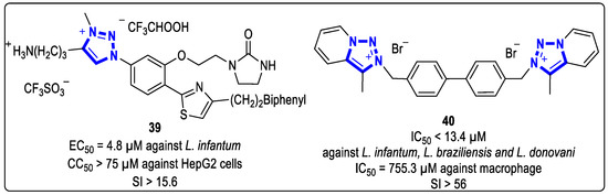 In 2017, Sanchez-Moreno et al. synthesized several new [1,2,3]triazolo[1,5-a]pyridinium salts using triazolopyridine compounds as raw materials, and studied their in vitro antileishmanial activities. The results showed that compound 40 had good activities against intracellular amastigotes and promastigotes of 3 species of Leishmania, including L. infantum, Leishmania braziliensis and Leishmania donovani, with IC50 values of 5.3–13.4 μM and 6.3–9.1 μM, respectively (Figure 18). The activities were better than that of the control drug Glucantime, with IC50 values of 18.0–25.6 μM and 18.4–30.4 μM, respectively. The selectivity index (SI > 56) of compound 40 was higher than the control drug Glucantime (SI < 1) [46].
