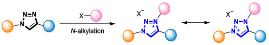 The highly efficient Cu(I)-catalyzed azide-alkyne “click” cycloaddition (CuAAC) can provide facile access to 1,4-disubstituted 1,2,3-triazoles and make them widely-used scaffolds in the field of synthetic chemistry [55,56]. Structurally complex 1,2,3-triazolium salts can be readily prepared from the corresponding 1,2,3-triazoles using alkyl halides, tosylate, trifluoromethane sulfonate, or tri-alkyloxoniums (Scheme 2) [49,50]. The alkylation process typically involves the use of a base to deprotonate the 1,2,3-triazole, followed by a reaction with the alkylating agent. This transformation generally tolerates a wide variety of functional groups at the N-1 and C-4 positions of the triazole ring and often occurs with generally N-3 regioselectivity [49,50].