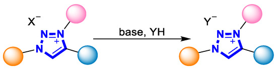 The resulting alkylated product can be further converted into the various 1,2,3-triazolium salts through protonation or appropriate transformations [4,50]. For example, the anionic counterion X− of the triazolium salt can be easily exchanged by simply washing with excess inorganic salt or using an exchange resin [17] (Scheme 3).