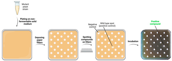 The drug drop test method. The mutant yeast strain is spread on square plates containing solid medium supplemented with a non-fermentable carbon source that allows basal minimal growth. Subsequently, small sterile filters are placed on the agar surface and spotted with molecules belonging to chemical libraries. In addition, negative and positive controls (i.e., the solvent in which molecules are dissolved and a wild-type spot, respectively) are deposed. The plate is then incubated for several days. After incubation, the positive compounds (active compounds) determine the appearance of a halo of enhanced growth around the corresponding filter. Created with BioRender.com, accessed on 29 May 2023.