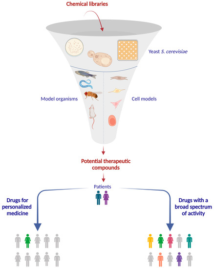 From yeast to patients: the drugs’ path. A huge number of molecules (belonging to chemical libraries) could be tested in yeast. Active compounds could be further analyzed in other model organisms and/or cell models, and each step determines a reduction in the number of potential therapeutic compounds. In the end, the most promising molecules could be administered to patients to treat MDs. Two outcomes could be envisaged: personalized medicine, when a drug is active only on a specific mutation and therefore applicable to a single or few patients; alternatively, some drugs could present a broad spectrum of activity, being suitable for a higher number of patients presenting mutations in different genes. Created with BioRender.com on 22 June 2023.