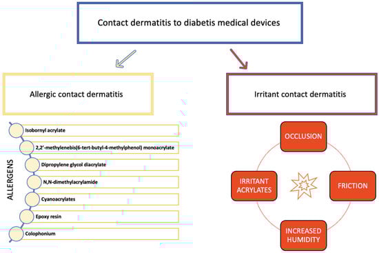 The management of diabetes mellitus (DM) has been vastly improved due to the broader access to technological devices such as glucose sensors (GS) and continuous subcutaneous insulin infusion (CSII) sets. The two main categories of GS are flash glucose monitoring (FGM) and continuous glucose monitoring (CGM). FGMs do not require calibration with self-measurements of glucose levels from finger prick tests, but users need to scan the sensor manually. On the other hand, CGMs provide real-time tracking of interstitial glucose levels, though some of them still require calibration []. Avoiding short-term complications of DM (such as diabetic ketoacidosis or frequent hypoglycemia episodes) and long-term complications (such as retinopathy, nephropathy or neuropathy) is essential and more accurate glycemic control facilitated by early use of GS and CSII by minimizes these risks. Use of medical devices also increases patients’ compliance with medication and enhances their quality of life []. Although the management of DM1 has been revolutionized by technological achievements, the incidence rate of dermatological complications resulting from using diabetes medical devices is increasing. The incidence of DM type 1 and DM type 2 continues to rise in Europe []. Over recent years, cases of irritant contact dermatitis (ICD) and allergic contact dermatitis (ACD) caused by diabetes medical devices have been reported, with acrylates being the most common culprit in the latter []. Apart from contact dermatitis, other cutaneous adverse effects frequently seen include skin infections, unspecified skin eruptions, urticaria or oedema []. Berg et al. report that almost 90% of patients using CSII experienced adverse skin effects with non-specific eczema being present most frequently in 25.7% of patients []. Since skin adverse effects remain the most common reason for discontinuation of CGM, it is crucial to determine the role of allergens in triggering contact dermatitis and the mechanisms beyond it []. This article focuses on allergens eliciting ACD as well as on the factors leading to ICD in diabetic patients.